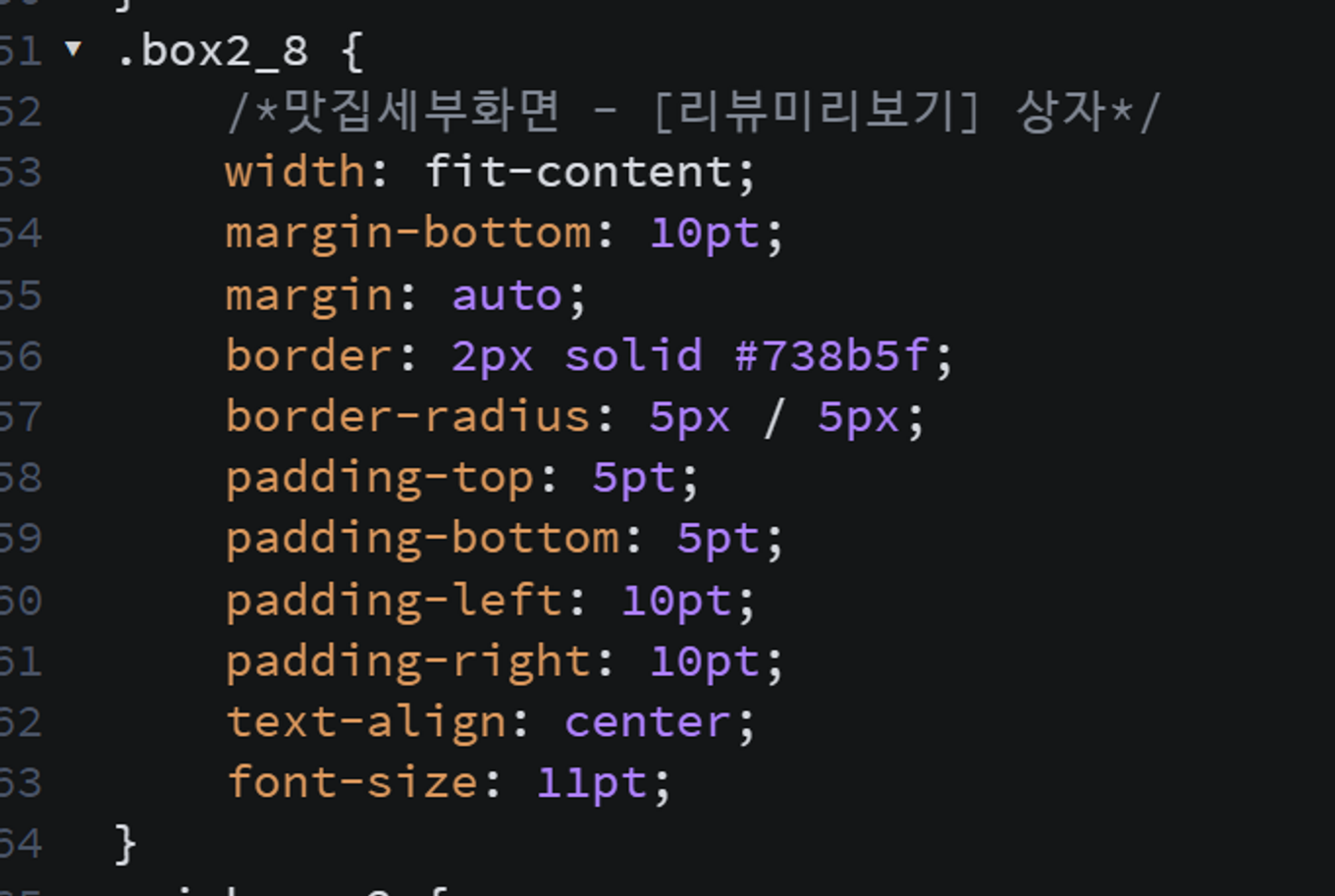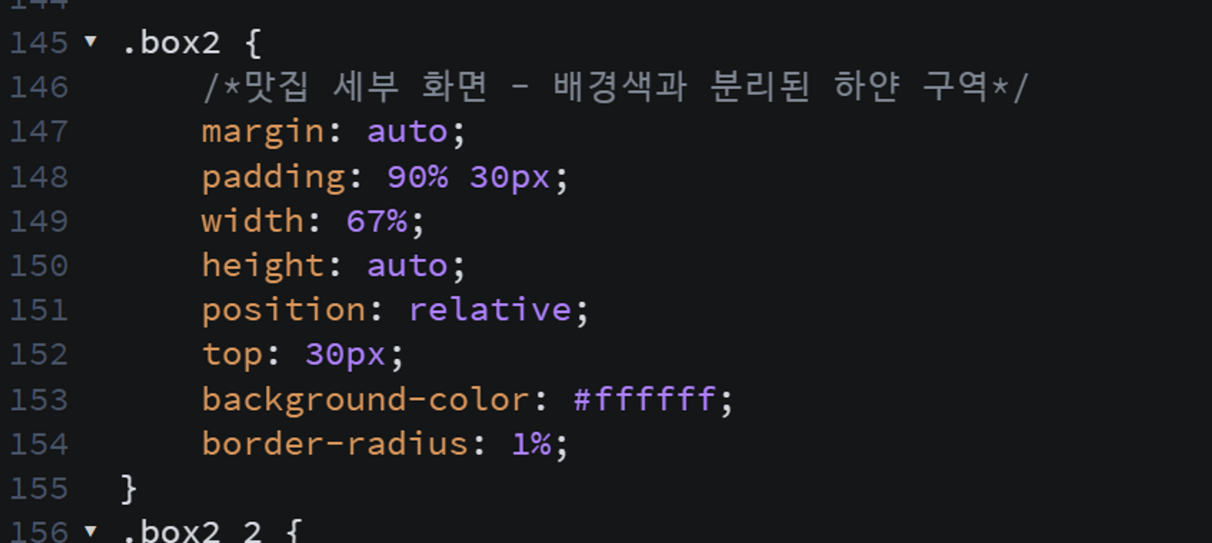 ㅤ맛집 세부 화면의 경우, 배경 위에 다시 box를 주어 흰색 내용칸을 만든 다음, 해당 내용칸을 6:4 세로 선을 중심으로 절반으로 나누어 각각의 요소별로 다시 위치시키는 디자인이었는데, 그러다보니 자꾸 내부 요소들이 부모 속성을 따르게 되어 배치 과정에서 온갖 방법을 죄다 활용해야 했다. 가장 골치가 아팠던 것은 중앙정렬이 되지 않는 것이었는데, 해당 문제의 약 85% 정도는 style에 margin: auto;를 주는 것으로 해결되었다. 이걸 적용할 경우 부모 div에 대해 해당 div의 모든 방향의 margin이 일괄 동일하게 적용되어 자동으로 중앙 정렬이 되었다.