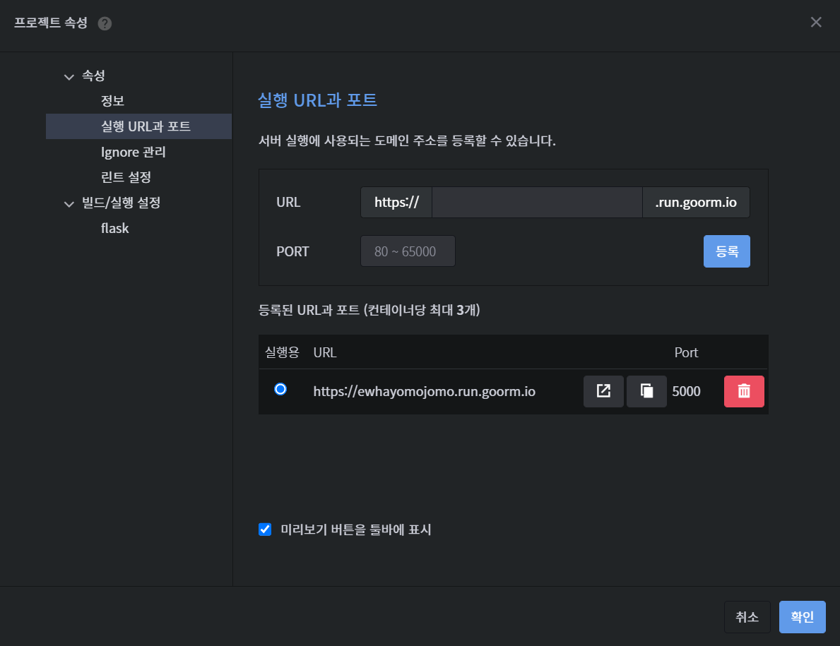 ㅤ프로젝트 속성에서 실행할 url과 Port 번호를 설정 및 등록한다.