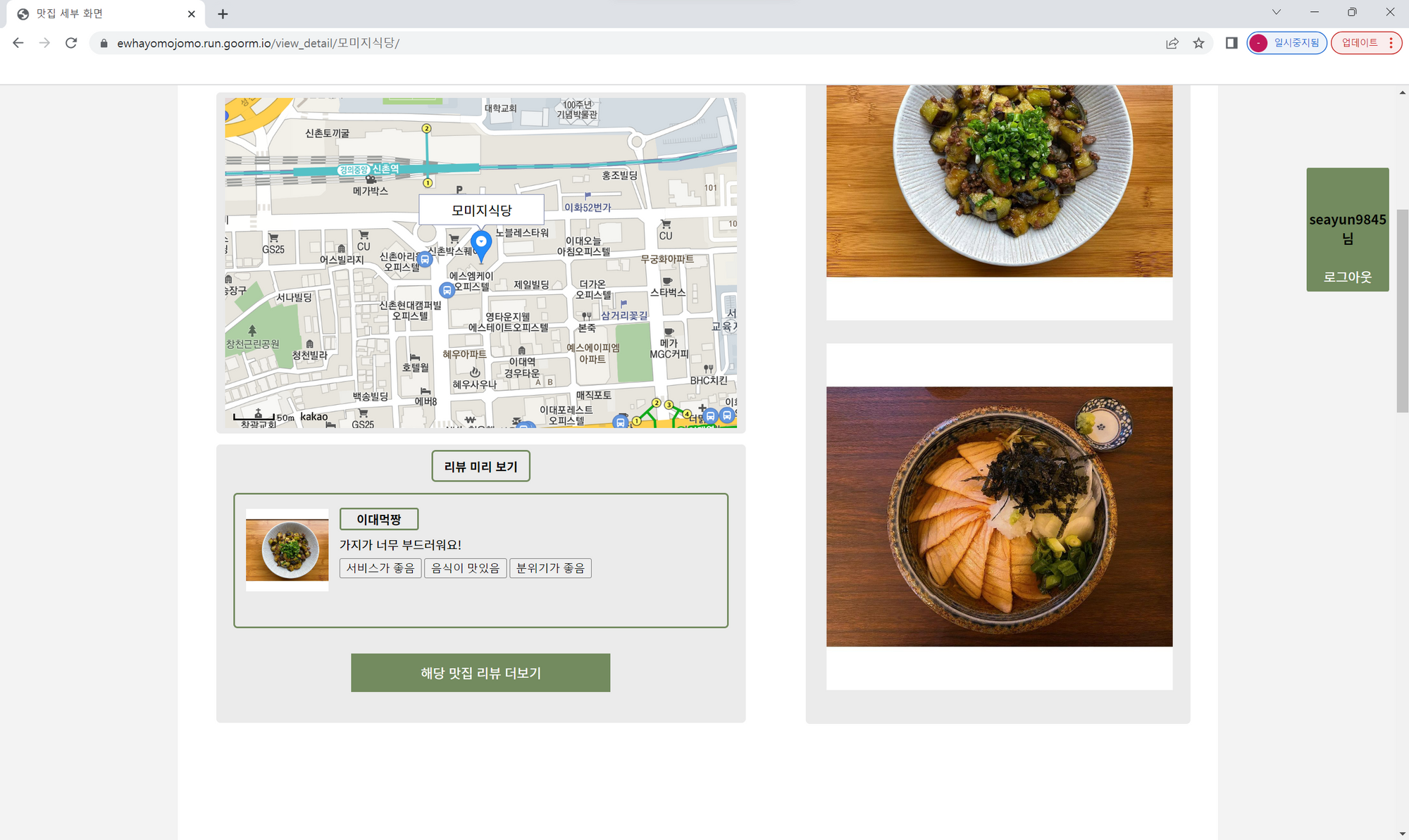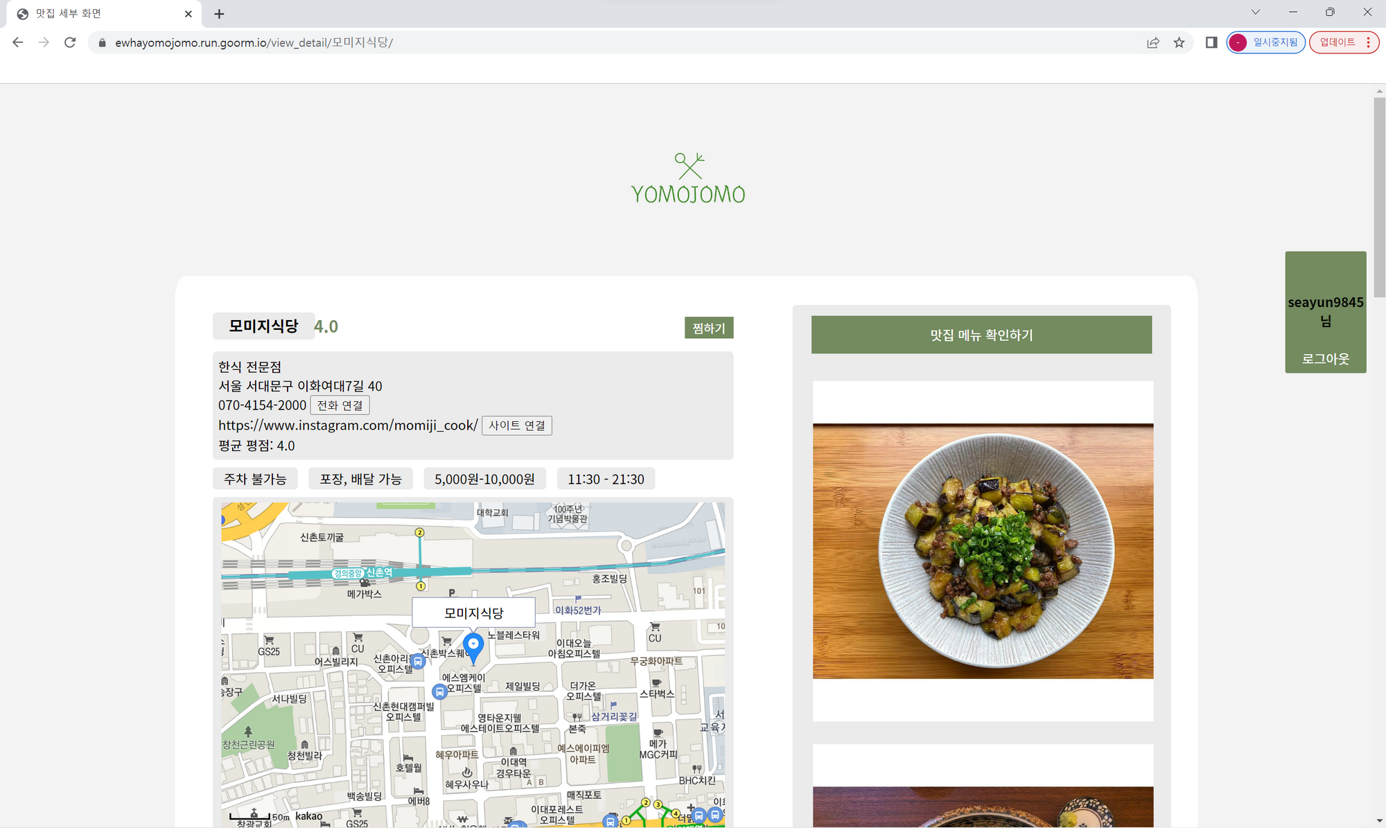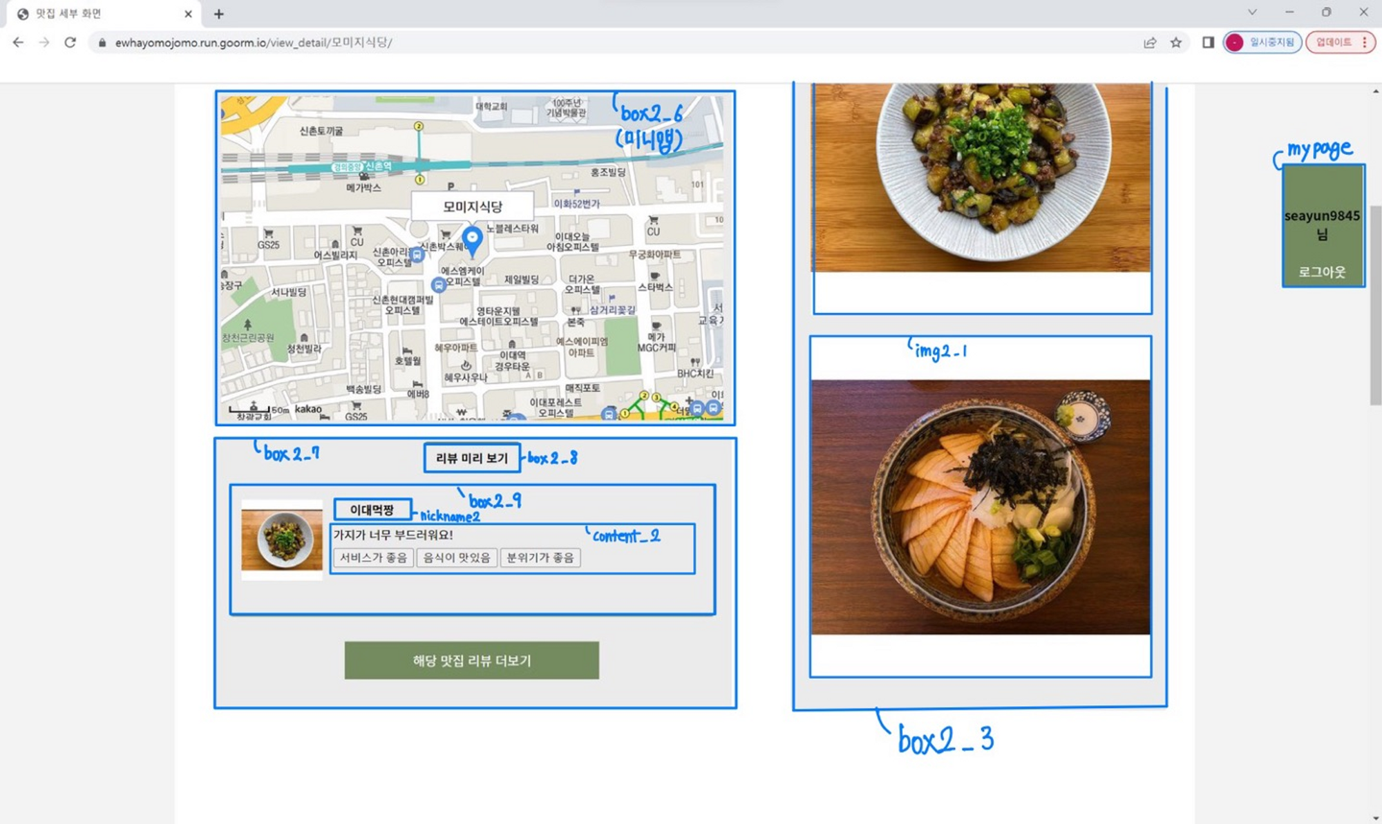 ㅤ우선, 일반적으로 가로가 긴 웹사이트의 특성과. 사용자가 정보 확인을 위해 스크롤을 아래까지 길게 내려야 하는 귀찮음을 고려하여 화면을 좌측과 우측(비율 약 6:4)으로 나누어 배치하여 해당 맛집의 정보들이 사용자에게 한 눈에 들어올 수 있도록 설계하였다. 또한 글로 된 정보가 몰려있을 경우 시선이 분산되는 것을 막고자 우측에는 맛집 메뉴의 사진을, 좌측에는 맛집 정보들을 배치하였다.