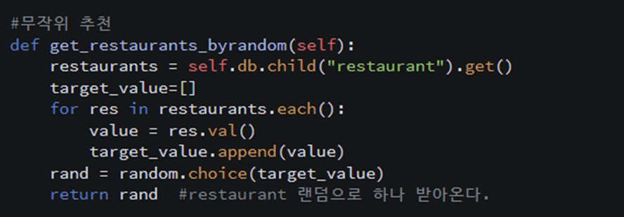 ㅤdatabase로부터 무작위로 식당을 받아오는 함수를 database.py 내에 get_restuarnats_byrandom(self) 으로 구현했다.