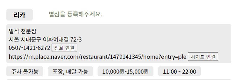ㅤ데이터베이스로부터 읽은 정보를 직접 활용했을 때 링크가 걸리지 않았기 때문에, 고민 끝에 받아온 {{data.res_site}} 데이터베이스 정보를 바로 링크로 활용하지 않고, 별도의 버튼으로 이용해 href 구현을 했다. 전화번호와 사이트 내용을 바로 클릭하지 않고 별도 버튼을 사용했더니 버튼 클릭시에 링크가 걸려서 잘 동작했다.