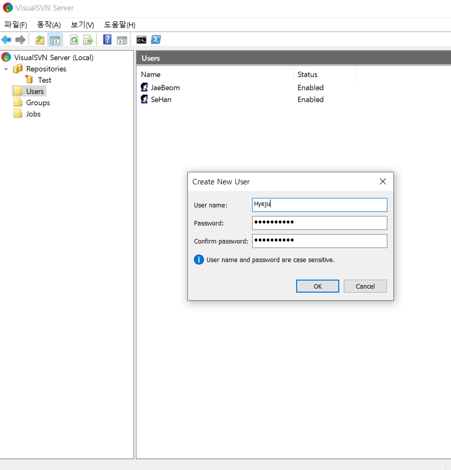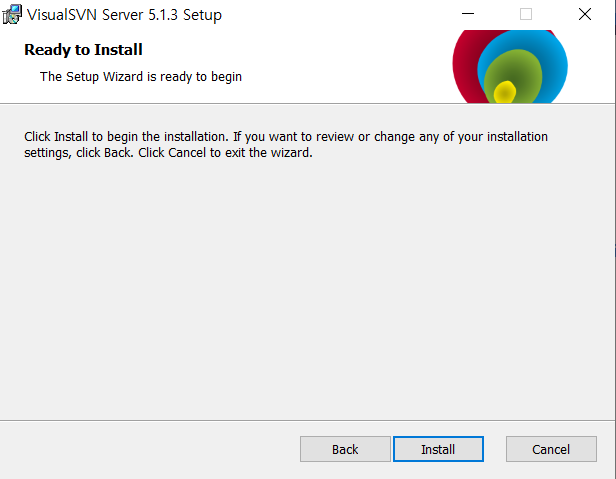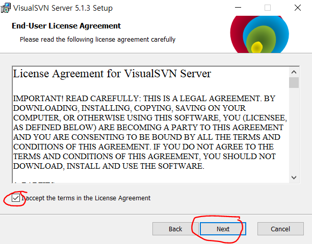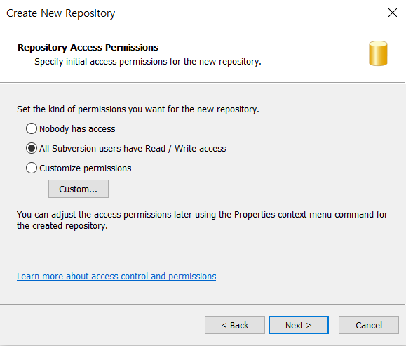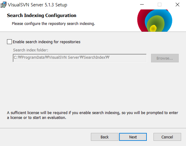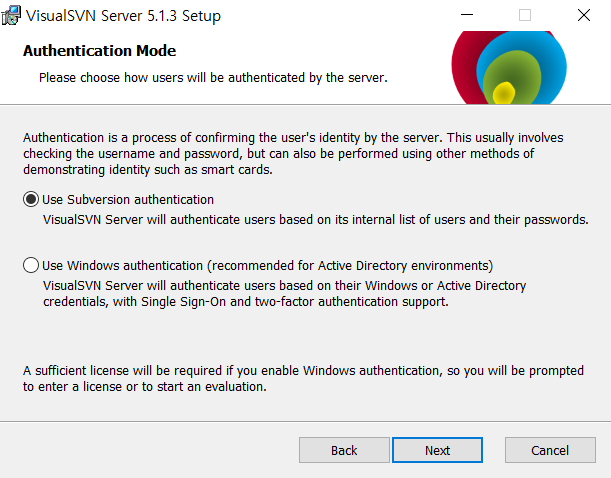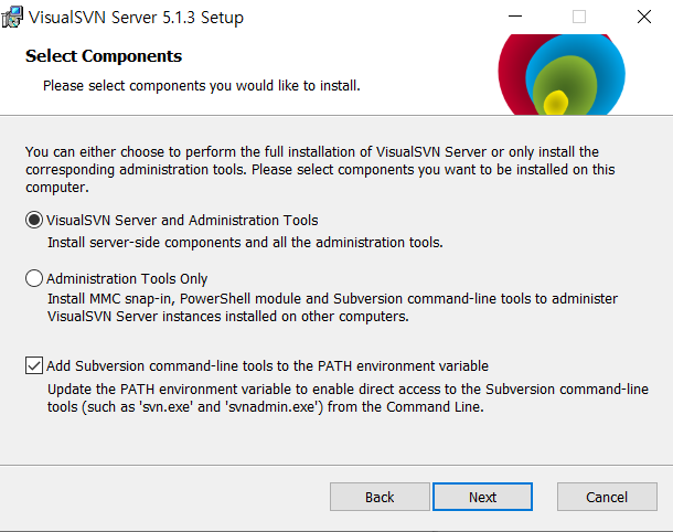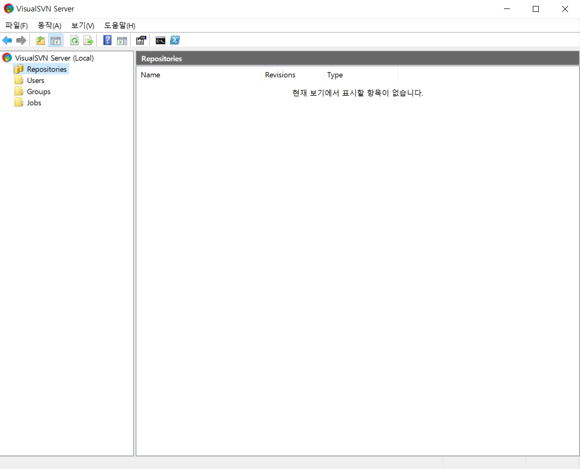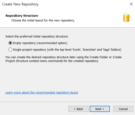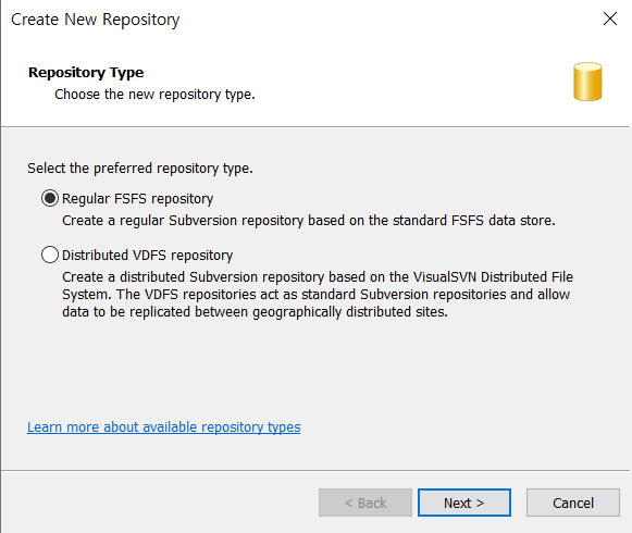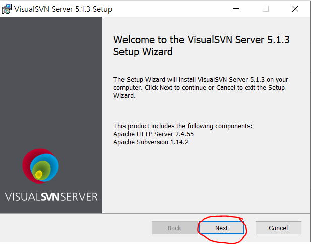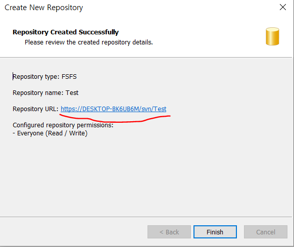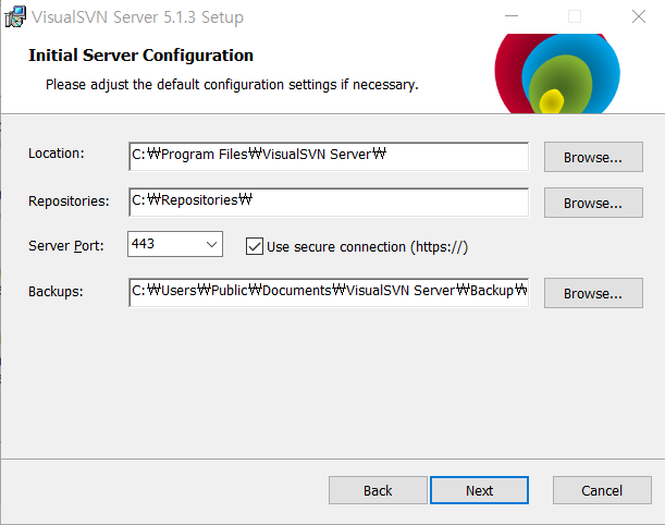 아마 회사라면 location은 devtool들을 모아놓은 C:\dev\VisualSVN Server\로 설정할 것이고 Repositories는 D:\Repositories\로 만들 것 같음