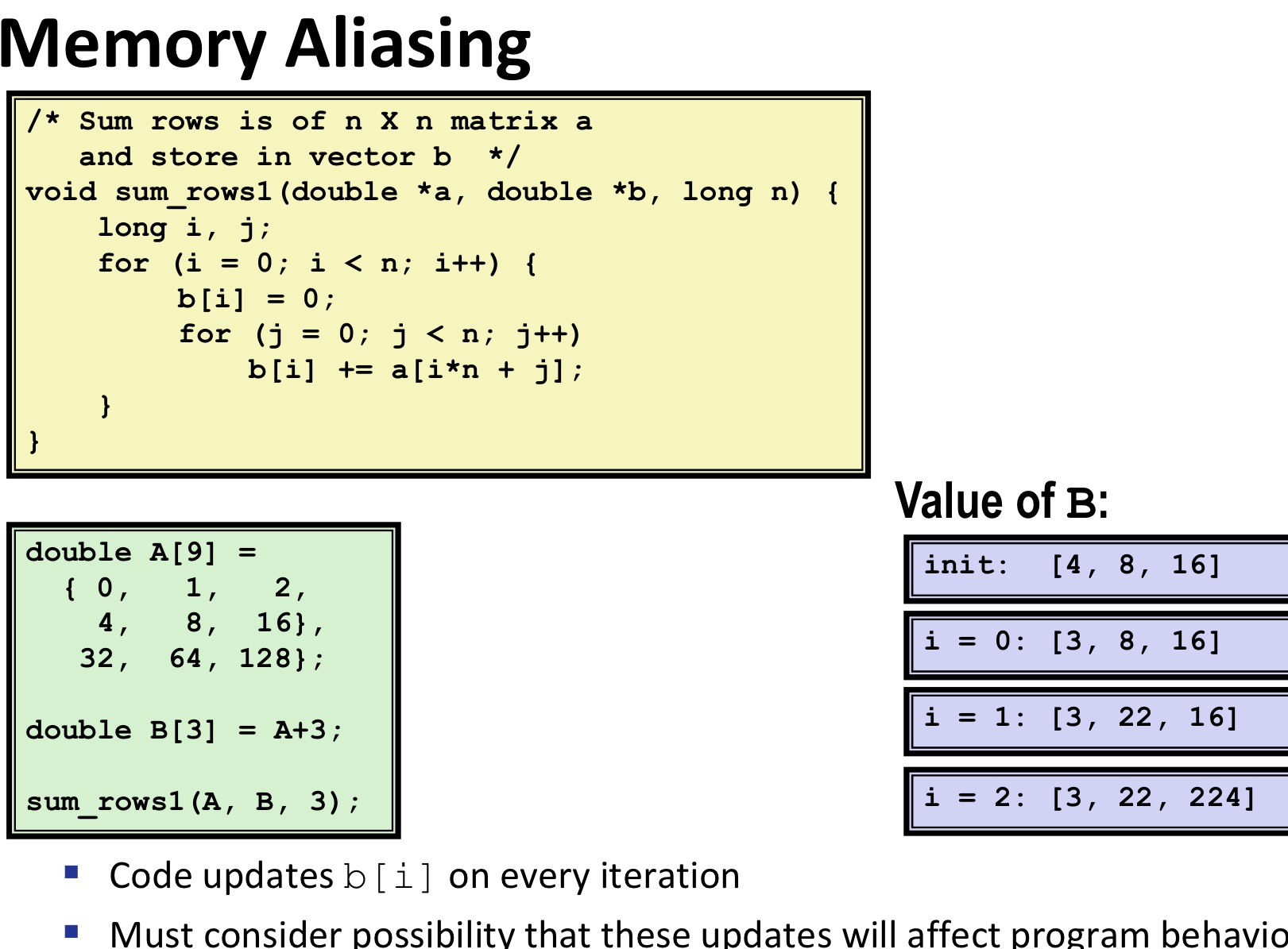 - b[I] += a[I*n + j]; 에서 b[I]에다 a를 더하고 있다. Double b[3] = A + 3; 과 같이 B가 배열 A의 중간 어딘가 부분을 가리키고 있었다고 하자 -> 이것이 memory aliasing, A는 크기가 9인 메모리 공간을 가리키고 있을텐데, B가 A의 한 가운데인 {4, 8 , 16} 쪽을 가리키고 있다.
