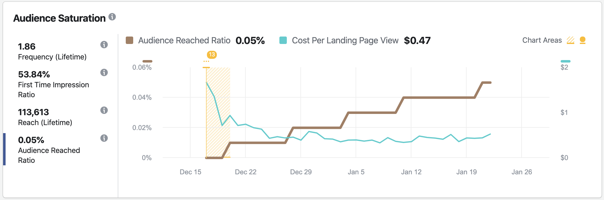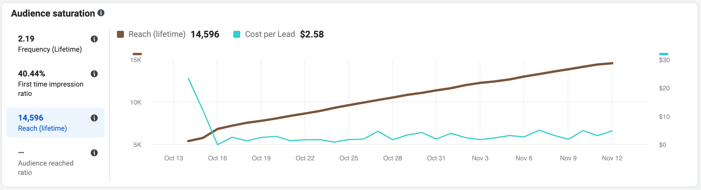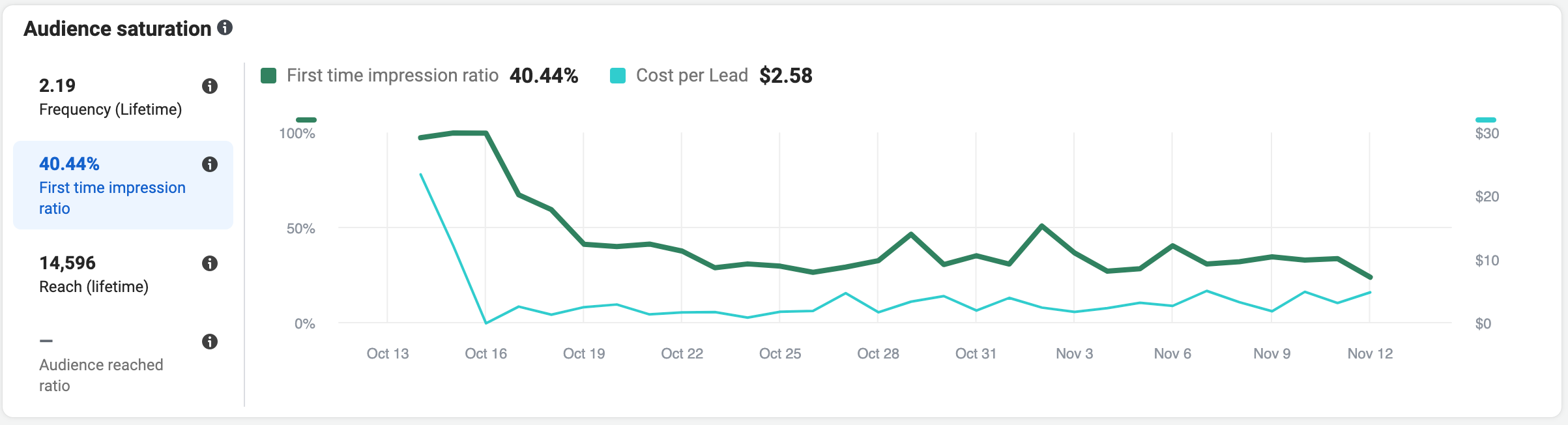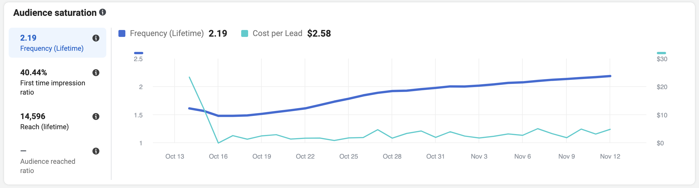 Audience Saturation 은 광고 유저군에 대해 이해하는 데 도움이 됨. 광고가 새로운 사람들에게 도달하지 못하고 비용이 증가하면 청중 포화가 높다는것을 의미합니다.