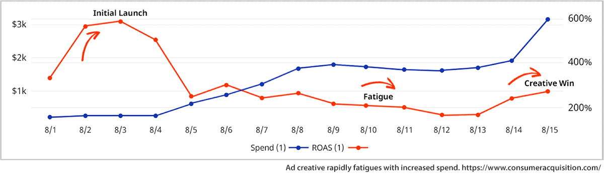 특히, 광고 예산이 큰 캠페인의 경우 크리에이티브 피로는 3~4일 만에 나타날 수 있음. 이는 예산이 많을수록 더 많은 사람들에게 빠르게 도달할 수 있기 때문임. 반면, 소규모 예산 캠페인은 피로가 쌓이는 데 12주 정도 걸리는 경우가 많음. 실제로 1억 달러 이상의 Facebook 광고 캠페인을 운영하면서 동일한 패턴이 반복되는 것이 확인되었으며, 지출이 증가할수록 광고 성과는 떨어지는 경향을 보임.
