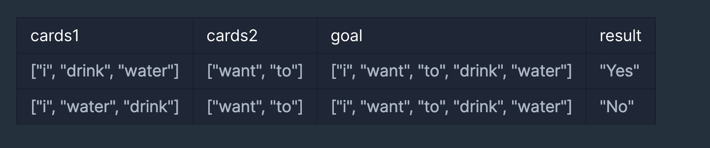 예를 들어 첫 번째 카드 뭉치에 순서대로 ["i", "drink", "water"], 두 번째 카드 뭉치에 순서대로 ["want", "to"]가 적혀있을 때 ["i", "want", "to", "drink", "water"] 순서의 단어 배열을 만들려고 한다면 첫 번째 카드 뭉치에서 "i"를 사용한 후 두 번째 카드 뭉치에서 "want"와 "to"를 사용하고 첫 번째 카드뭉치에 "drink"와 "water"를 차례대로 사용하면 원하는 순서의 단어 배열을 만들 수 있습니다.