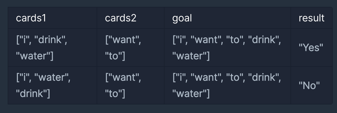 예를 들어 첫 번째 카드 뭉치에 순서대로 ["i", "drink", "water"], 두 번째 카드 뭉치에 순서대로 ["want", "to"]가 적혀있을 때 ["i", "want", "to", "drink", "water"] 순서의 단어 배열을 만들려고 한다면 첫 번째 카드 뭉치에서 "i"를 사용한 후 두 번째 카드 뭉치에서 "want"와 "to"를 사용하고 첫 번째 카드뭉치에 "drink"와 "water"를 차례대로 사용하면 원하는 순서의 단어 배열을 만들 수 있습니다.