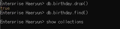 컬렉션의 drop 메서드는 해당 컬렉션을 제거한다. 해당 컬렉션이 제대로 제거되었는지 확인하기 위해서는 해당 컬렉션의 find 메서드로 전체 도큐먼트를 조회해 보거나 컬렉션 목록을 조회해보면 된다.