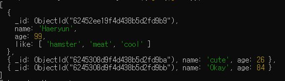 db안에 있는, birthday라는 콜렉션 안에, 새로운 도큐먼트를 생성한다. 그 도큐먼트의 속성은 name, age, like가 있다. (그리고 그 뒤에 붙은 건 세부적인 속성값이다.)