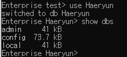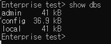 : 현재까지 생성된 전체 DB 목록을 조회한다. 몽고 DB에는 기본적으로 admin, config, local 이라는 DB가 존재한다. DB 이름과 함께 우측에는 DB 용량도 표시되어 있다.