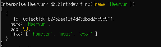관계형 데이터베이스의 where 키워드와 유사하다. 위 예시에서는 birthday 컬렉션에서 name 필드의 값이 문자열 Haeryun과 일치하는 모든 도큐먼트를 검색한다.