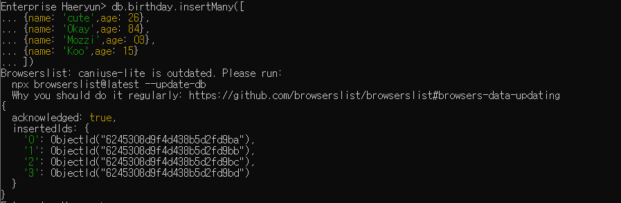 db.[컬렉션 이름].insertMany()