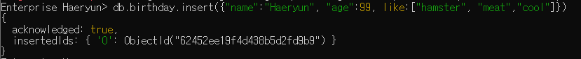 db.birthday.insert({"name":"Haeryun", "age":99, like:["hamster", "meat","cool"]})