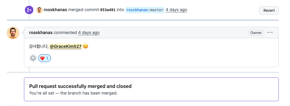 오픈 소스 기여를 했다는 사실만으로도 너무 좋아서, 운이 좋았다고 생각했습니다.