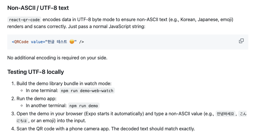 또한, README에 비ASCII 문자 테스트를 위한 예시로 일본어나 이모지를 포함한 내용도 제안드렸고, 해당 내용도 함께 반영되었습니다. (와! 외국인이 만든 라이브러리에 한국어가 있다니!)