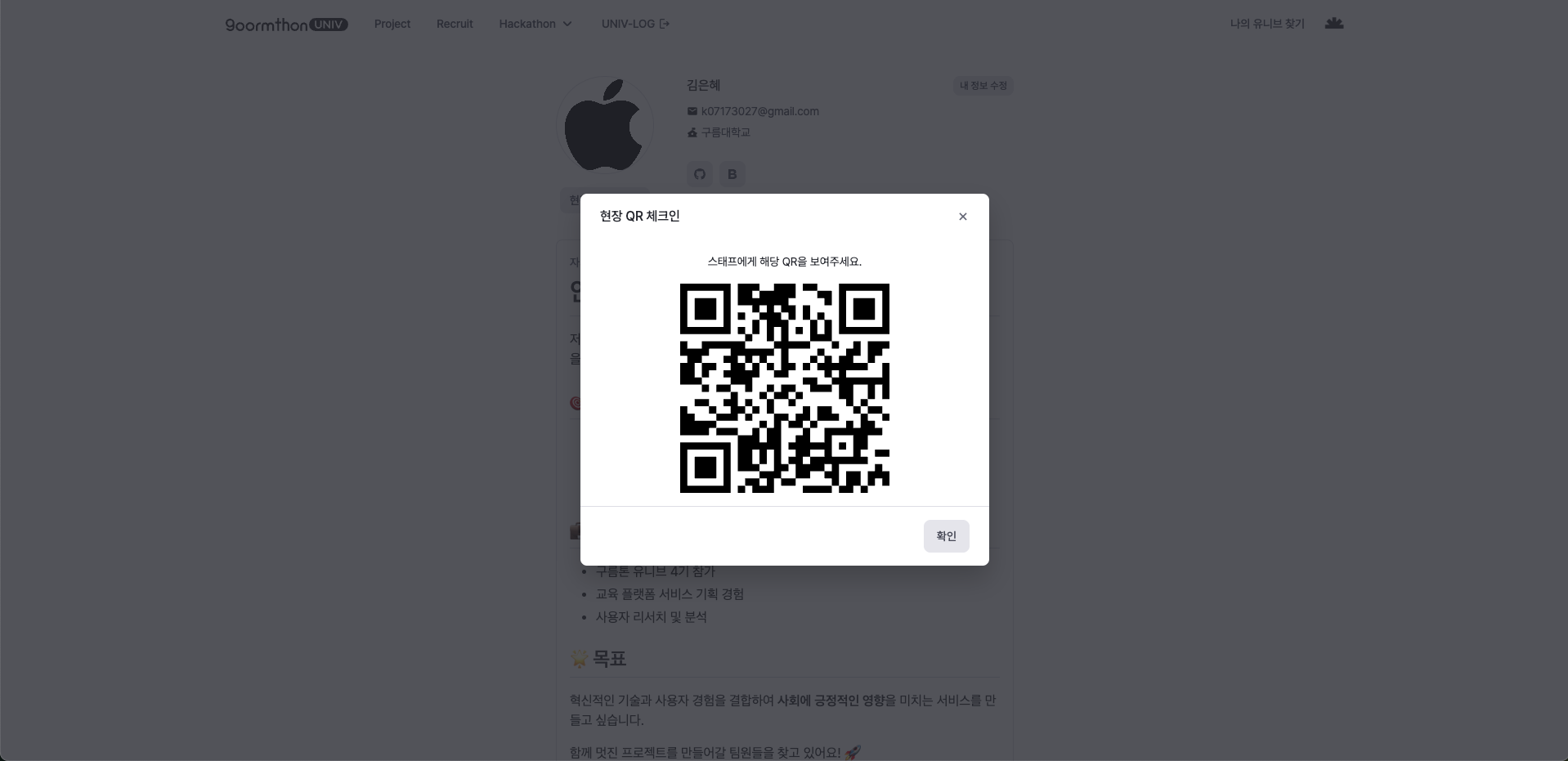 그래서 이번 기수에는 현재 팀빌딩으로 이용했던 사이트, 구름톤 유니브 공식 사이트 내 마이 페이지에 QR을 두기로 했습니다.