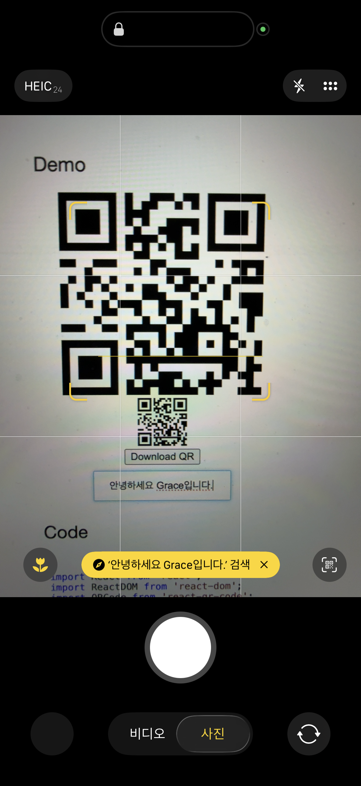 그래서 우선 encodeuriComponent함수를 통해 글 같은 비ASCII 문자들이 QR에 들어갈 때 깨지는 것을 방지했습니다. 물론 스캔할 때는 그래서 값이 이런식으로 나오겠지만요.
