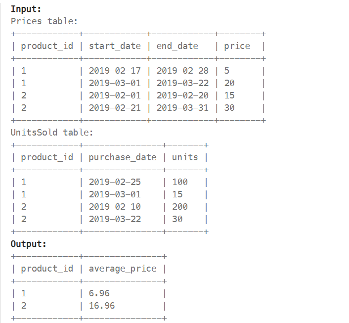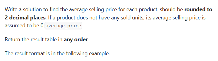 with avg_price as (select p.product_id, round((SUM(units*price)/SUM(units)),2) average_price from prices p left join unitssold u on p.product_id = u.product_id and u.purchase_date between start_date and end_date group by p.product_id) # select product_id, case when average_price is null then 0 else average_price end average_price from avg_price평균 구해준 걸 with문으로 해서 다시 average_price가 null일때 0 넣는 조건을 줘서 추출해줌.