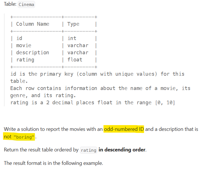 where id = 1 or id % 2 = 1 and description != 'boring'✅정답 코드