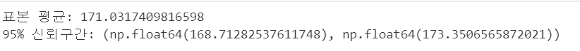 # 95% 신뢰구간 계산 -- 모집단 평균이 이 구간에 들어 온다.