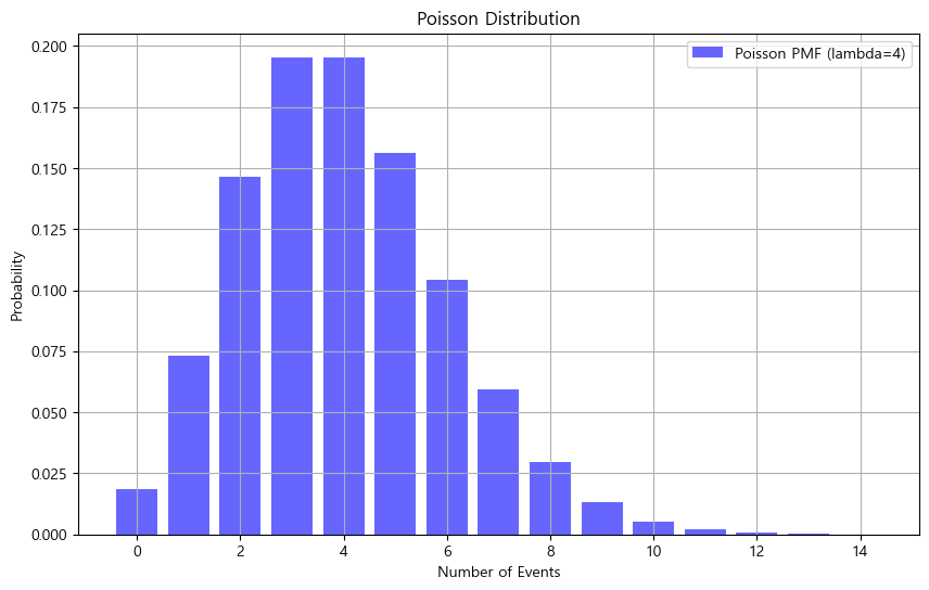 푸아송 분포: 일정 시간 동안 드문 사건의 발생 횟수를 모델링하며, 사건들이 독립적이고 일정한 평균 발생률을 가집니다.