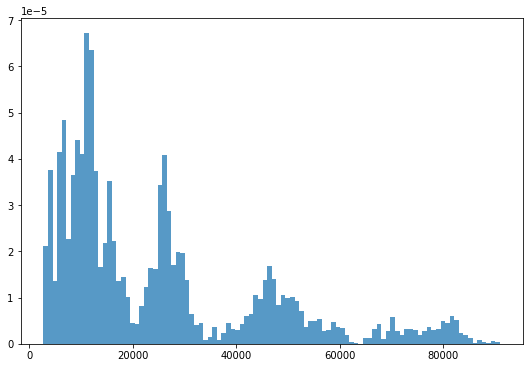 _ = plt.hist(df.Close, 100, density=True, alpha=0.75)