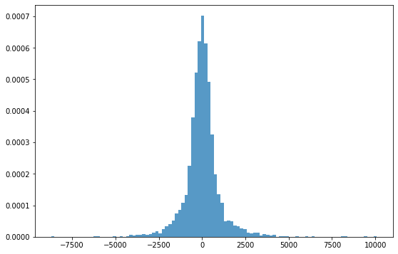 _ = plt.hist(result.resid, 100, density=True, alpha=0.75)