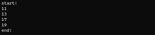 for (printf("start!\n"); i < 20; ++i) {