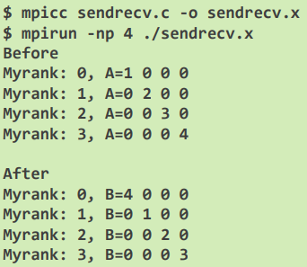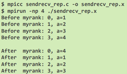 MPI_Sendrecv(&A[myrank],1,MPI_INT,inext,0,&B[myrank],1,MPI_INT,iprev,0, \