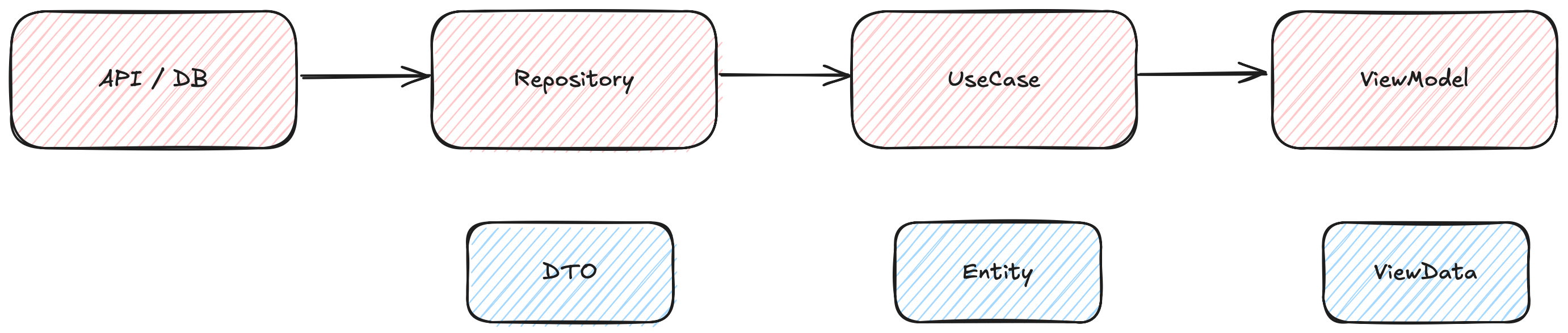 MVC에서 뷰 컨트롤러를 뷰와 뷰 모델로 나눈 것 처럼, 클린 아키텍처를 적용한다면 뷰 모델을 데이터 레이어, 도메인 레이어, 프레젠테이션 레이어로 나눌 수 있습니다.