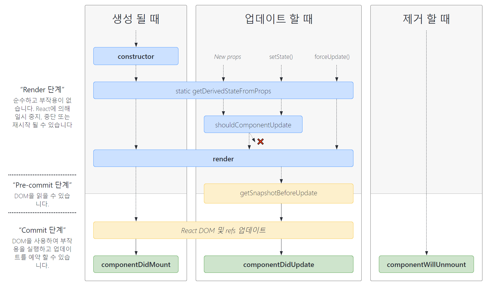 컴포넌트가 렌더링 준비하는 순간부터 페이지에서 사라질 때까지의 모든 순간