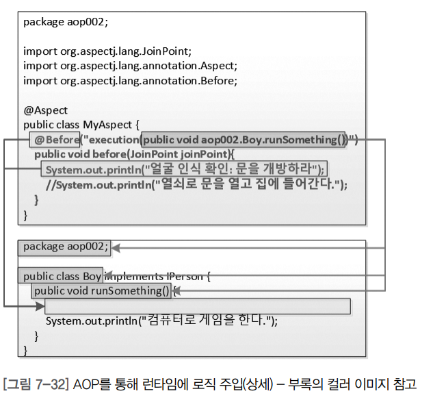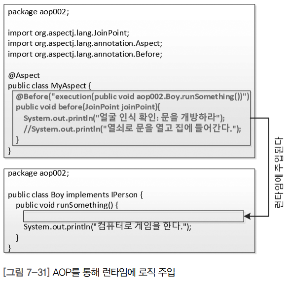 - 6.2절에서 설명했던 프록시 패턴을 이용해 횡단 관심사를 핵심 관심사에 주입하는 것이다.
