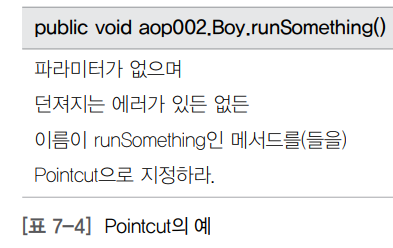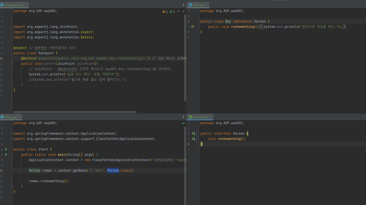 - boy와 girl 빈은 AOP 적용 대상이기에 등록할 필요가 있고, myAspect 빈은 AOP의 Aspect이기에 등록할 필요가 있다.
