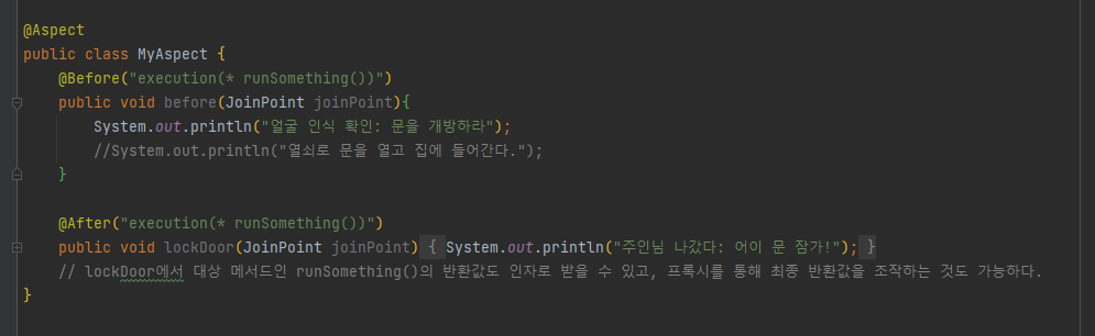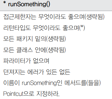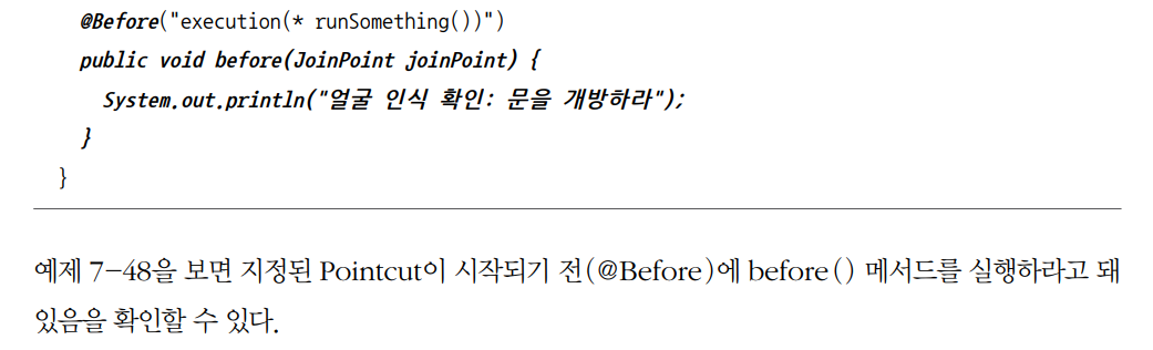 @Before("execution(* runSomething())") // 대상 메서드 실행 전에 이 메서드를 실행하겠다는 의미