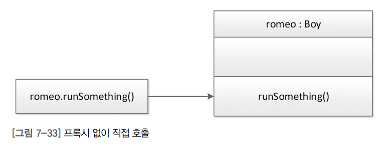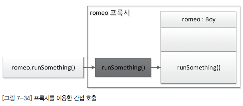 💡- 스프링 AOP는 프록시를 사용, 그런데 호출하는 쪽(romeo.runSomething() 메서드 호출)에서나 호출 당하는 쪽(romeo 객체), 그 누구도 프록시가 존재하는지조차 모른다. 오직 스프링 프레임워크만 프록시의 존재를 안다.