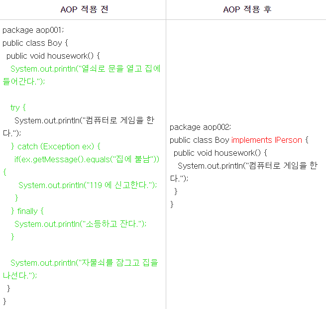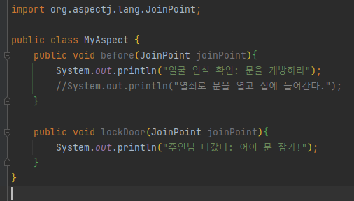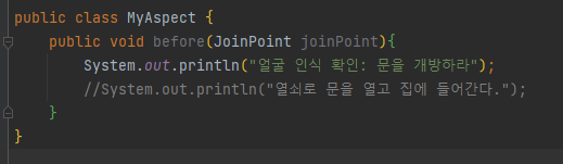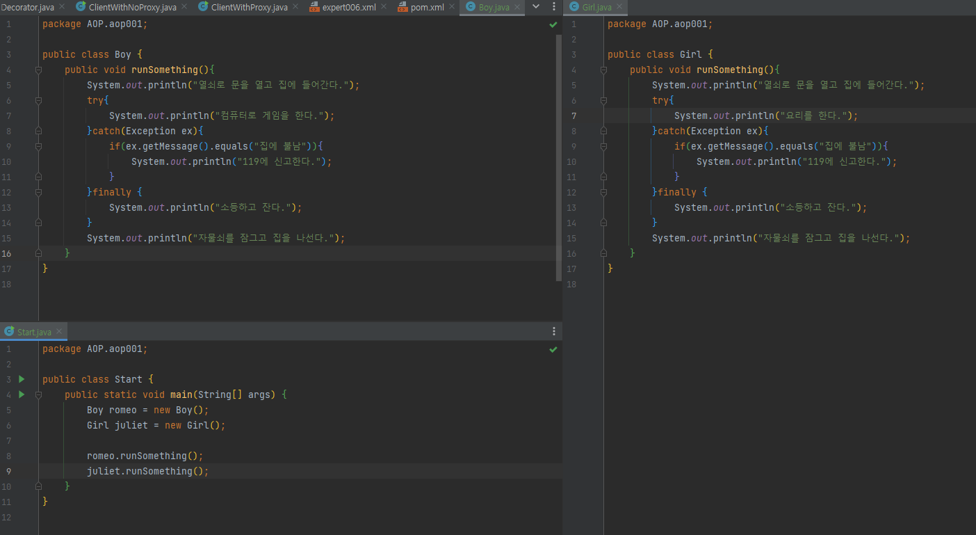 - Boy.java와 Girl.java에서 공통적으로 나타나는 횡단 관심사를 모두 삭제했지만, 결국 누군가는 횡단 관심사를 처리해야 한다. MyAspect.java가 횡단 관심사를 처리하게 된다.