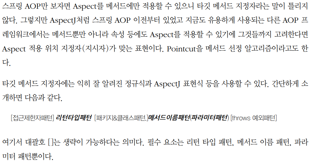 - Pointcut : 👉 횡단 관심사를 적용할 타깃 메서드를 선택하는 지시자(메서드 선택 필터)