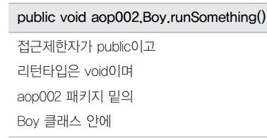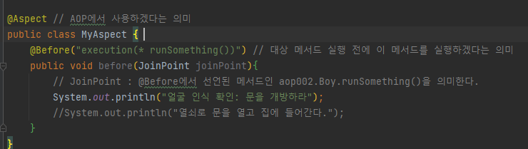// JoinPoint : @Before에서 선언된 메서드인 aop002.Boy.runSomething()을 의미한다.