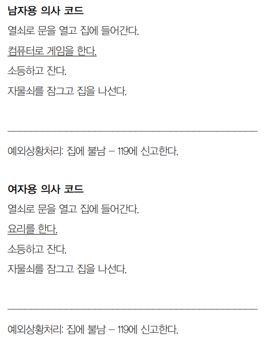 System.out.println("열쇠로 문을 열고 집에 들어간다.");