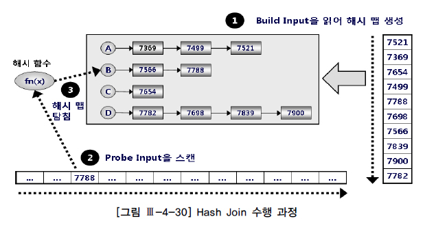 조인할 테이블 중 하나의 테이블을 해시 함수를 사용하여 해시 테이블로 반환한 후,