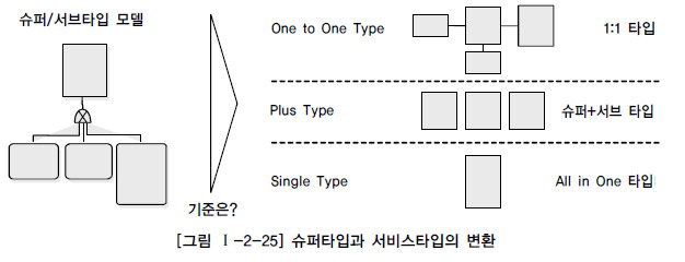슈퍼타입은 공통된 특성과 동작을 가지며, 해당 서브타입들에게 상속된다.슈퍼타입의 특성을 물려받으면서, 추가적인 특성을 가질 수 있다. 동물의 특성인 이름과 나이를 물려받으면서 특성을 추가할 수 있다.하나로 통합하는 것이 더 효율적일 때 사용된다. 여러가지 유형의 데이터를 하나의 테이블에 모두 통합하여 저장하는 방식을 의미한다.