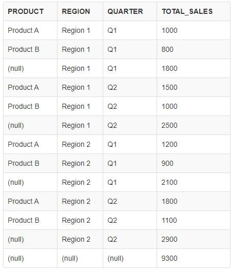 SELECT product, region, quarter, SUM(amount_sold) AS total_sales FROM sales GROUP BY ROLLUP (product, region, quarter);