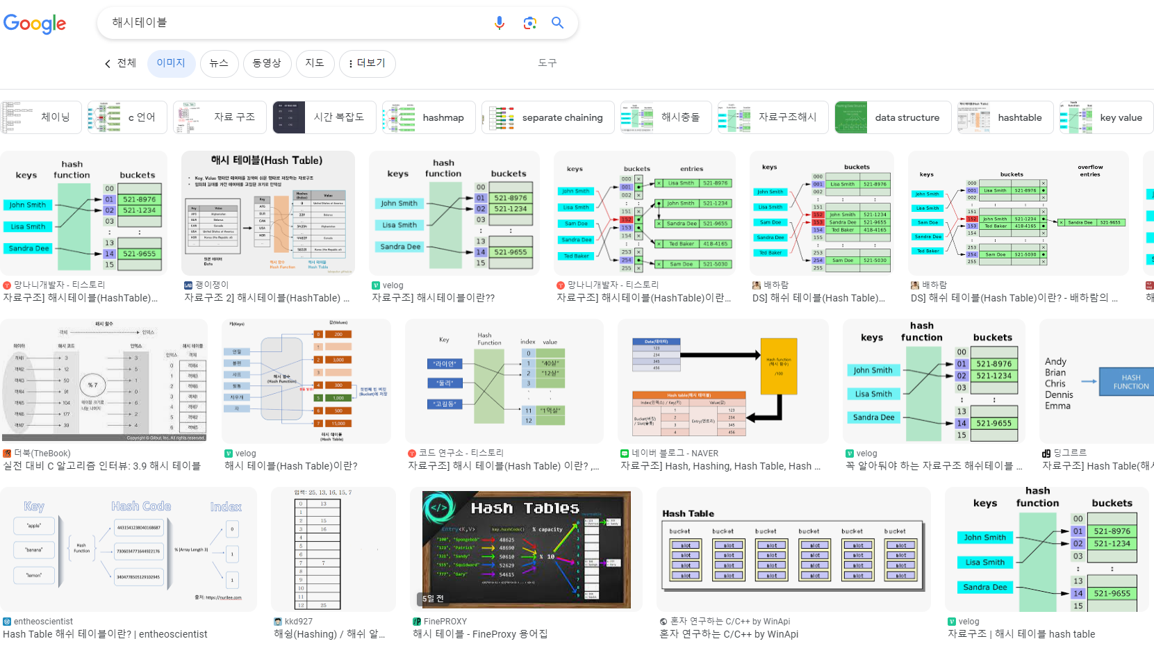 - 체이닝(Chaining), 개발 주소법(open addressing) 등