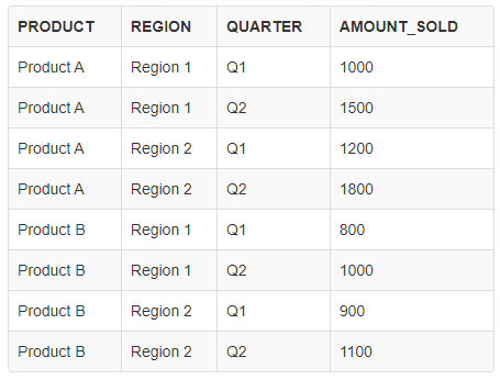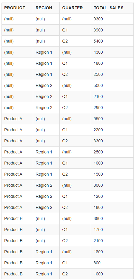 SELECT product, region, quarter, SUM(amount_sold) AS total_sales FROM sales GROUP BY GROUPING SETS ( (product, region, quarter), (product, region), (product), () );