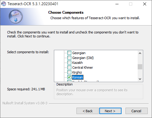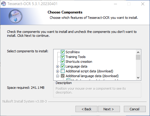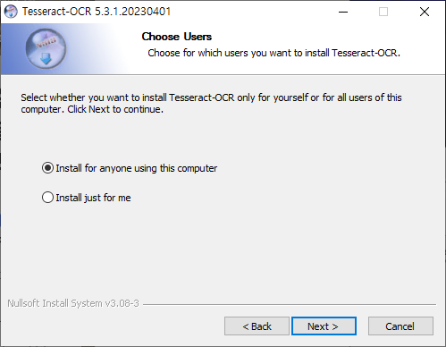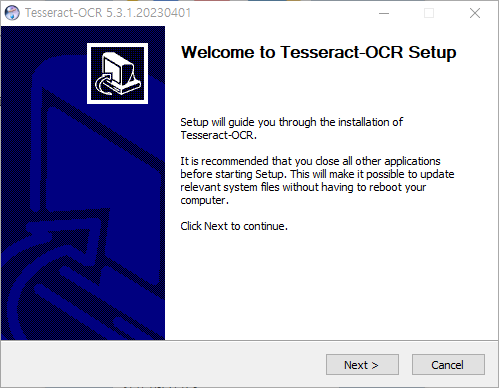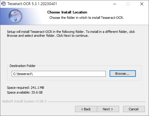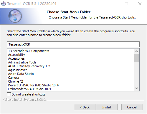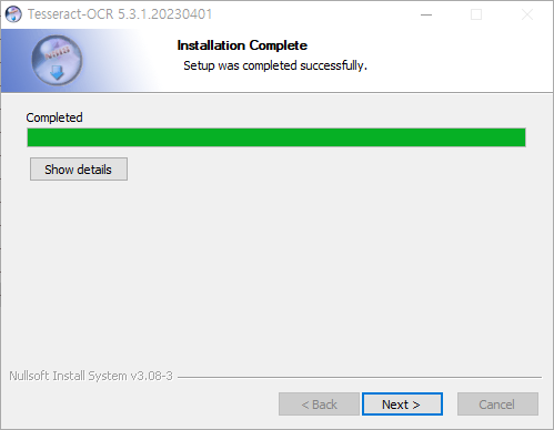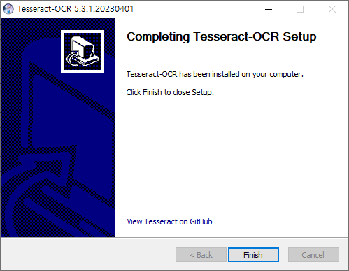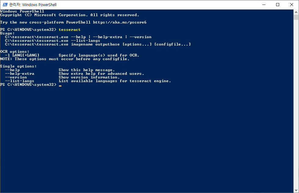 powershell을 열어 관리자 권한으로 실행하여 tesseract라는 다음과 같은 명령어를 실행시켜 화면과 같은 내용이 나오면 정상이다.