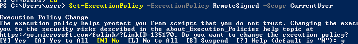 PS C:\Users\user> Set-ExecutionPolicy -ExecutionPolicy RemoteSigned -Scope CurrentUser