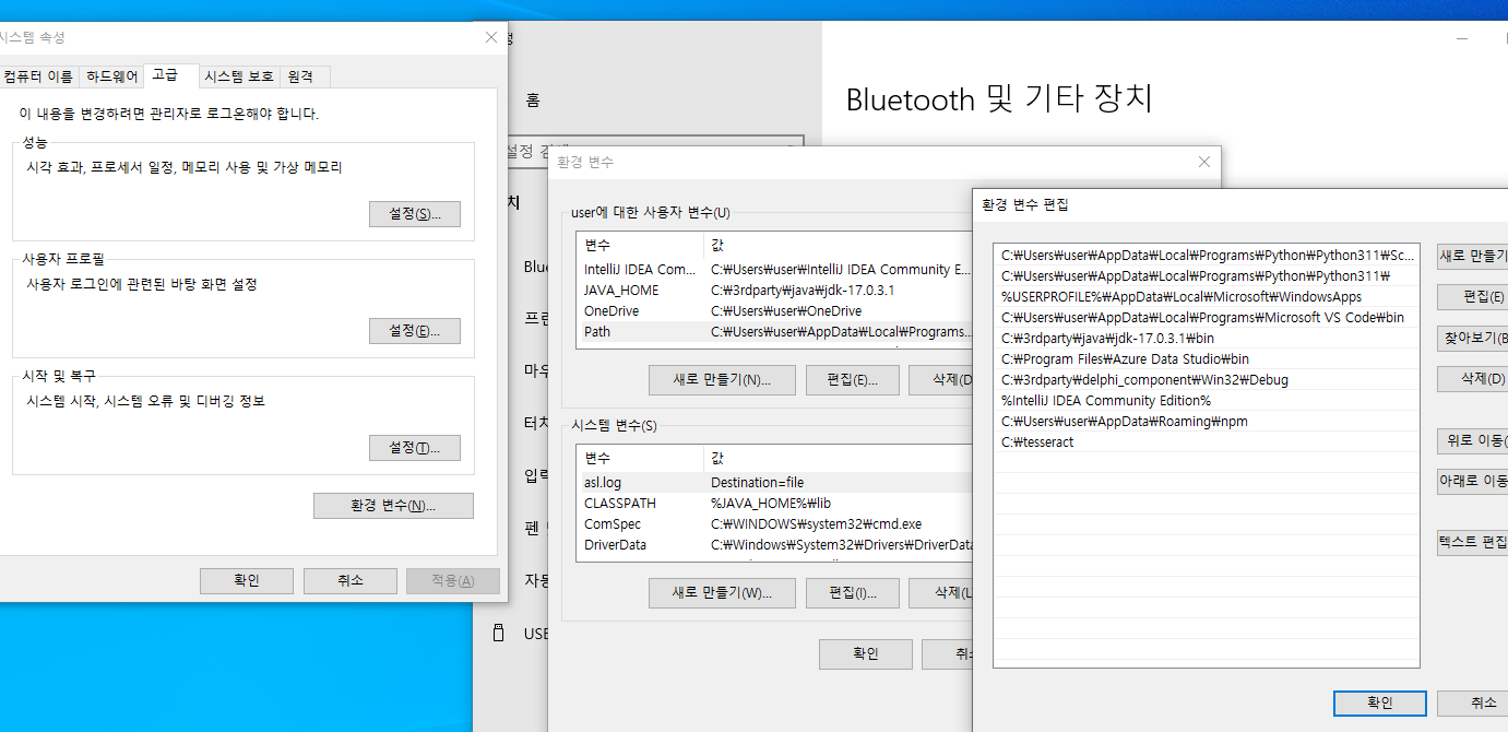 고급 시스템 설정 - 고급 - 환경 변수 - user에 대한 사용자 변수 - path 에 추가