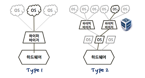 - Type 2 : 호스트형 / 일반적인 소프트웨어처럼 호스트 OS 위에서 실행
