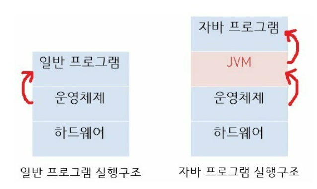 - 일반 프로그램은 운영체제 위에서 프로그램이 실행된다면, 자바 프로그램은 운영체제가 JVM을 실행시키면 JVM이 프로그램(클래스 파일)을 실행시킨다.
