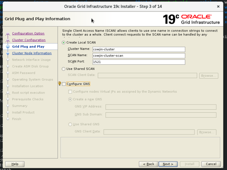 Cluster명, Scan명, SCAN Port를 입력. SCAN명에는 사전에 DNS에 등록했던 이름을 입력한다.